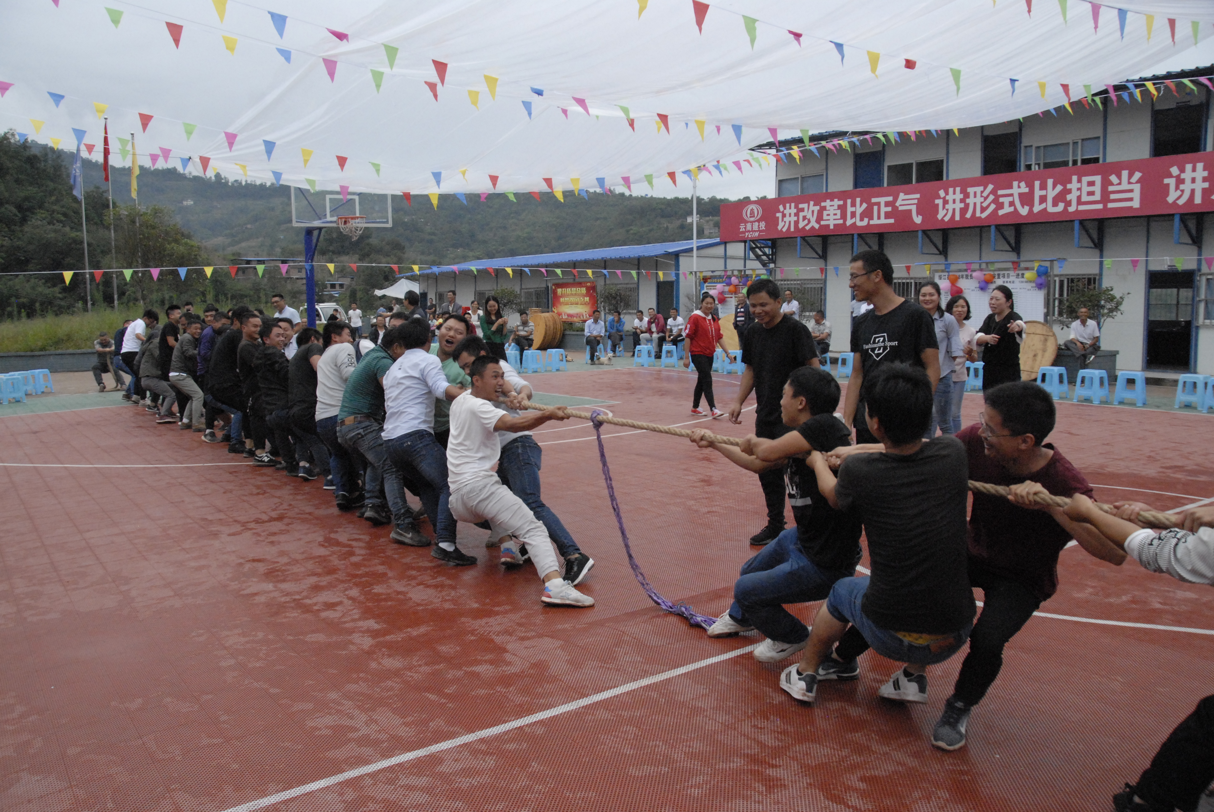 24日,綏江項目指揮部組織開展了“走進綏江 情暖中秋”中秋晚會。晚會從下午開始,活動設(shè)置了“日積月累”“二人同心、其力斷金”“搶凳子”“擊鼓傳花”“猜燈謎”“拔河”等游戲。來自綏江縣住建局、監(jiān)理方、集團總承包一部、公司參建項目部、勞務(wù)公司等186名奮戰(zhàn)在一線的職工參與了活動。大家積極參與游戲,贏取獎品,現(xiàn)場氣氛十分熱烈?;顒舆€送出了三項幸運獎。隨后,大家高唱建投之歌,并在項目籃球場上集體用餐,共度佳節(jié)。用餐過后,到場領(lǐng)導(dǎo)共同演唱了歌曲“為了誰”,參建直管部的經(jīng)理、書記共同演唱了“擼起袖子加油干”,隨后大家依次登臺演唱,臺下的觀眾配合拍子搖動手機閃光燈,讓活動現(xiàn)場變成了一場星空演唱會?;顒又?,第一直管項目部職工迅速安置餐桌,排隊為大家端菜的情景,形成了一道別樣的風(fēng)景線。