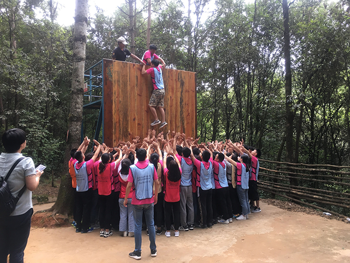 新員工們被分成了四支隊伍,通過七米高空作業(yè)、呼啦圈傳遞、運球接力、九人十腳、團結(jié)墻項目等不同的項目訓練,體會到了凝聚力對一個團隊的重要意義。