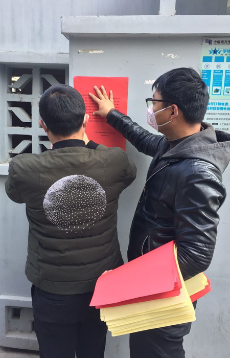 在家屬區(qū)張貼防控宣傳單