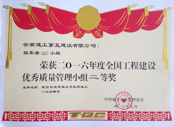 2016年7月7日,公司第四直管項(xiàng)目部申報(bào)的“提高屈曲約束支撐節(jié)點(diǎn)板安裝一次合格率”成果獲中國(guó)施工企業(yè)管理協(xié)會(huì)2016年度全國(guó)工程建設(shè)優(yōu)秀質(zhì)量管理小組一等獎(jiǎng);“提高后澆帶獨(dú)立柱支撐施工一次合格率”成果獲中國(guó)施工企業(yè)管理協(xié)會(huì)2016年度全國(guó)工程建設(shè)優(yōu)秀質(zhì)量管理小組二等獎(jiǎng)。此前,該小組的以上兩項(xiàng)成果均獲得2016年度云南省工程建設(shè)優(yōu)秀質(zhì)量管理小組一等獎(jiǎng)。