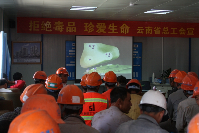 根據(jù)省委宣傳部、省禁毒委關(guān)于《云南省禁毒人民戰(zhàn)爭實施方案》和中華全國總工會與國家禁毒委員會辦公室在全國廣大職工中開展以“抵制毒品、參與禁毒”為主題的拒絕毒品“零計劃”宣傳教育活動的有關(guān)要求,為增強職工禁毒意識,提高了大家識毒、拒毒、防毒的能力,公司工會組織禁毒宣傳小組來到昆明市官渡區(qū)五里中央商務區(qū)回遷安置房項目部,向現(xiàn)場包括六公司和十公司在內(nèi)的職工及勞務工人180余人進行了禁毒知識宣傳活動。活動上,禁毒宣傳小組不僅給大家進行禁毒知識的宣傳,還免費為現(xiàn)場職工進行心臟、脈搏、血壓等常規(guī)體檢,為冬季防流感提供咨詢平臺,宣傳高血壓、高血脂、糖尿病等常見慢性疾病的預防保健知識,發(fā)放了板藍根沖劑、抗病毒顆粒、風寒風熱感冒沖劑和小柴胡等防治流感藥品100多盒,還發(fā)放了創(chuàng)可貼、醫(yī)用酒精、棉球等日常外用藥品和200盒安全套。