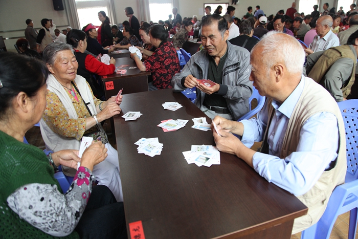 老職工們或四人一組或兩人一組分別在撲克牌和象棋比賽中激烈地戰(zhàn)斗著。只見撲克牌賽場上,老職工們密切配合、沉著應戰(zhàn);而象棋比賽組里,大家冷靜思考、步步為營。有的人眼看自己勝券在握臉上不時露出笑意;有的人面色慌張卻故作鎮(zhèn)定以防被別人看穿;而有的人則泰然處之、心平氣和地面對比賽。對陣雙方比技術、比智慧,賽成績、賽友誼。旁觀的人也不時發(fā)出陣陣叫好。