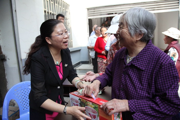 退管會的工作人員給參賽老職工們發(fā)送禮品