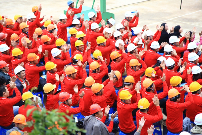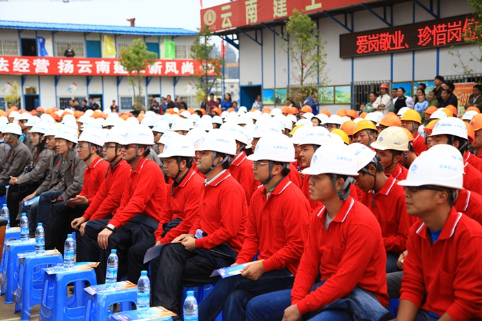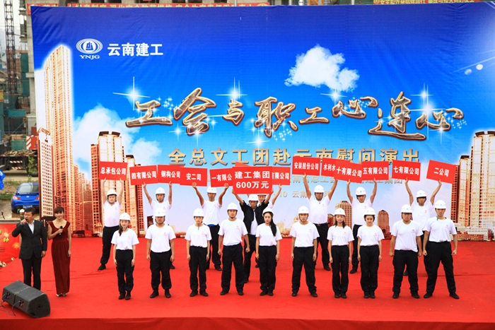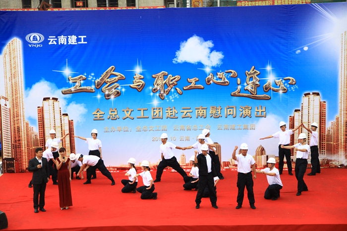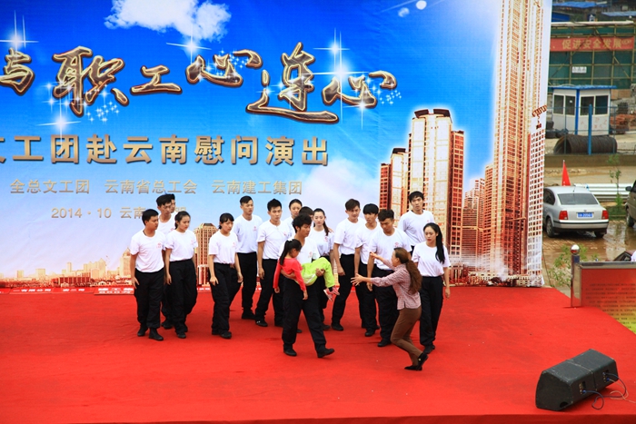 慰問演出當(dāng)天下午,天氣陰冷,但絲毫不影響演員們的熱情,在《兄弟干杯》、《愛的奉獻(xiàn)》、《誰說女子不如男》等幾首歌唱過后,現(xiàn)場的氣氛逐漸升溫,激情歌手大鵬的《向天再借五百年》、《老婆你真不容易》進(jìn)一步釋放了觀眾的熱情,現(xiàn)場氣氛好不熱烈。隨后,公司音詩畫節(jié)目《決戰(zhàn)魯?shù)?感恩大愛》登臺上演,以旁白,舞蹈,對白等多種形式重現(xiàn)了抗震救災(zāi)、后勤保障、愛心捐款、愛心獻(xiàn)血等過程中的真人真事,動人瞬間,讓現(xiàn)場觀眾們?nèi)谌牍适虑楣?jié)當(dāng)中,深受感動,齊聲為云南建工拍手叫好。