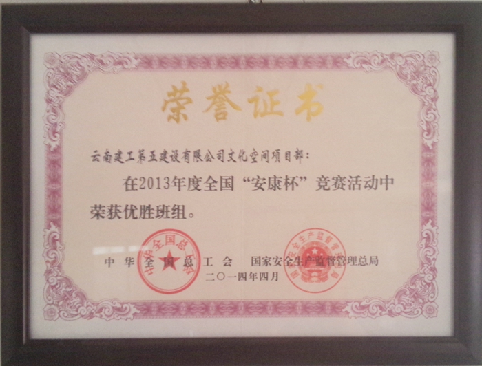 技術(shù)支持: 方森科技 6月18日,中華全國(guó)總工會(huì)和國(guó)家安全生產(chǎn)監(jiān)督管理總局聯(lián)合在北京召開2013年度全國(guó)“安康杯”競(jìng)賽表彰暨經(jīng)驗(yàn)交流電視電話會(huì)議,會(huì)上,中華全國(guó)總工會(huì)、國(guó)家安全生產(chǎn)監(jiān)督管理總局發(fā)布總工發(fā)〔2014〕19號(hào)《關(guān)于表彰2013年度全國(guó)“安康杯”競(jìng)賽先進(jìn)集體和優(yōu)秀個(gè)人的決定》,公司第四直管項(xiàng)目部文化空間項(xiàng)目部榮獲2013年度“全國(guó)安康杯競(jìng)賽優(yōu)勝班組”稱號(hào)。