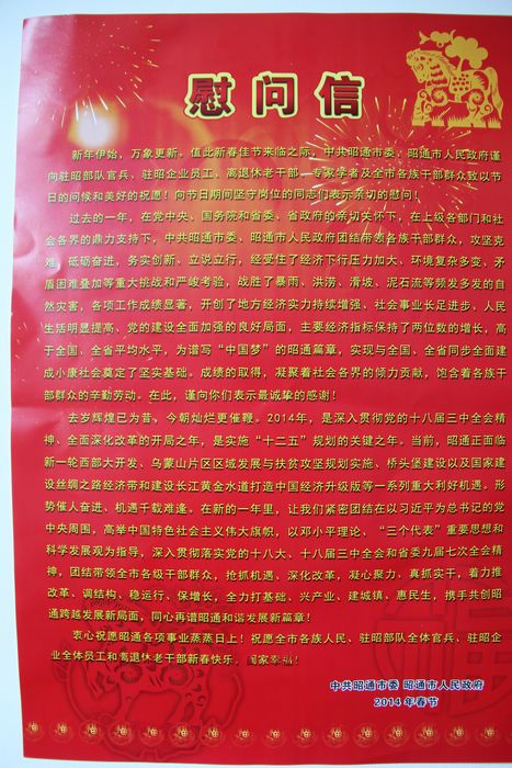 2014年1月13日,昭通市委書(shū)記劉建華在百忙之中趕到昭通市昭陽(yáng)區(qū)2012年城鎮(zhèn)保障性安居工程項(xiàng)目慰問(wèn)云南建工駐昭的兒女們,并致慰問(wèn)信。集團(tuán)公司代表、云南省城鄉(xiāng)建設(shè)投資有限公司昭通分公司總經(jīng)理蔣璽發(fā)言表示感謝。