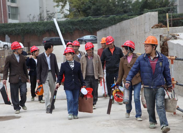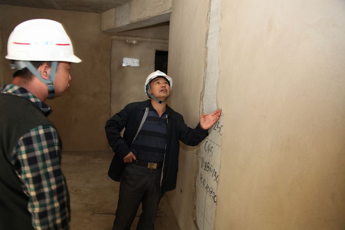 公司董事長李文智正在認真查看內(nèi)墻抹灰情況