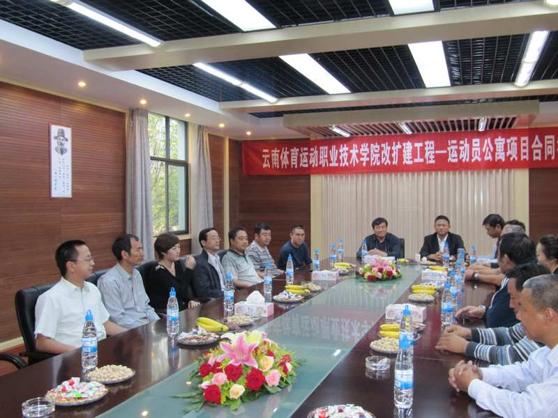 該工程的簽訂得到了云南省體育局和公司領導的重視,合同簽訂當天,省體育局局長沈俊鑌、建管中心主任曾延成、學院黨委書記兼院長李錫云及院領導班子,公司董事長楊福和、總經(jīng)理魏華、副總經(jīng)理張迎躍、經(jīng)營部負責人及直管部領導班子全部到場參加。沈俊鑌局長在簽訂儀式上表示,與五公司合作的第一個項目——云南體育運動職業(yè)技術學院教學大樓項目,得到了省體和學院的一致好評,所以有了第二次的合作,同時他表示,希望與五公司建立長期合作關系。楊福和也表示,無論項目大小,五公司都會以精品工程的要求去完成,一如既往地交上滿意答卷。