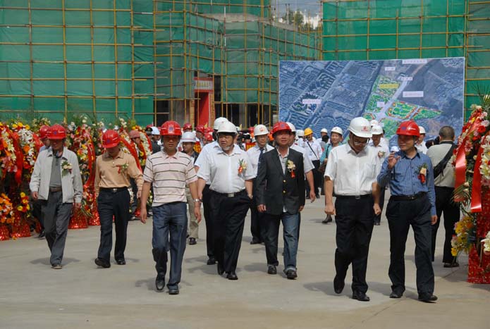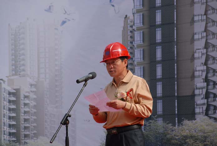 由于場地狹窄,起初塔吊、雙籠吊及鋼筋場的布置極為困難。另外,麗水雅苑工程屬于典式住宅,轉(zhuǎn)角較多,外懸挑架在立面立桿和橫桿的設(shè)置過程中也遇到困難。尤其14棟開工比其它棟號晚,地下一層,地上三十三層,又是麗水雅苑最高的四棟高層之一,卻要求與整個(gè)項(xiàng)目同時(shí)封頂。有壓力才有動力,五建公司始終本著對建設(shè)單位負(fù)責(zé)的原則,充分發(fā)揮面對困難、敢于亮劍的拼搏精神,在工期緊、異型結(jié)構(gòu)難度大的情況下,項(xiàng)目部始終堅(jiān)信辦法總比困難多,找新辦法,克服新困難,工作抓重點(diǎn)、抓難點(diǎn)、發(fā)現(xiàn)問題及時(shí)有效落實(shí)到位,努力做到“四要”(即節(jié)奏要快、標(biāo)準(zhǔn)要高、態(tài)度要好、工作要踏實(shí))、“三不”(即工作等不起、慢不得、坐不住)。通過嚴(yán)格管理和有效的激勵措施,終于迎來了麗水雅苑項(xiàng)目于2010年5月27日勝利封頂,集團(tuán)公司黨委副書記、紀(jì)委書記張戰(zhàn)國親自到場祝賀,參加了封頂儀式,五建公司總經(jīng)理方菊明代表施工單位發(fā)言,公司總工程師焦倫杰等出席了封頂儀式。