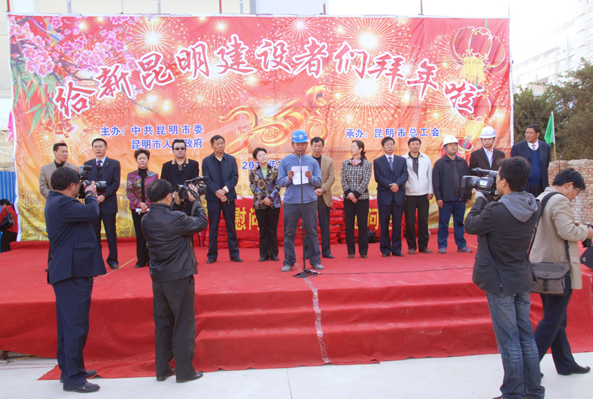 2月4日上午,受昆明市委、市政府委托,昆明市總工會主席楊麗等領導同志率團到云南建工第五建設有限公司昆明工人文化宮建設工地,給包括農民工在內的新昆明建設者拜年,給建設者送來新春的祝福和溫暖的禮品。楊麗主席和工會干部以及昆明市楓葉職工藝術團的演員們分別獻上精彩的歌舞。