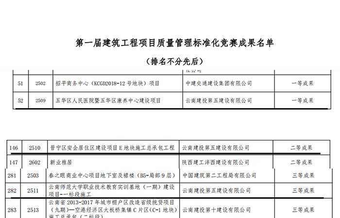 近日,中國建筑業(yè)協(xié)會質(zhì)量管理與監(jiān)督檢測分會公布了第一屆建筑工程項目質(zhì)量管理標(biāo)準(zhǔn)化競賽的成果名單。公司參評的五華區(qū)人民醫(yī)院暨五華區(qū)康養(yǎng)中心建設(shè)項目獲一等成果、晉寧區(qū)安企居住區(qū)建設(shè)項目E地塊施工總承包工程獲二等成果,云南師范大學(xué)職業(yè)技術(shù)教育實訓(xùn)基地(一期)建設(shè)項目-一標(biāo)段施工獲三等成果。其中,五華區(qū)人民醫(yī)院項目在云南省組織的初賽中脫穎而出,成功入圍決賽并代表云南省赴深圳參與答辯,在激烈的答辯過程中,項…