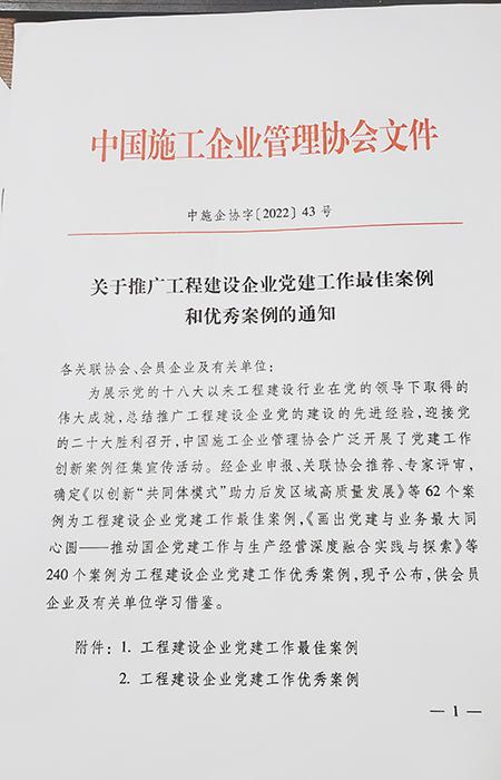 公司喜獲“工程建設(shè)企業(yè)黨建工作優(yōu)秀案例”榮譽(yù)