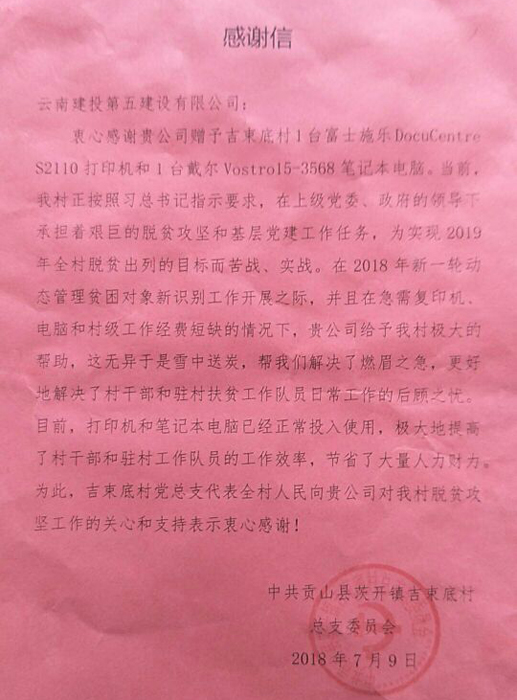 捐贈(zèng)辦公設(shè)備 助力脫貧攻堅(jiān)——公司收獲吉束底村感謝信