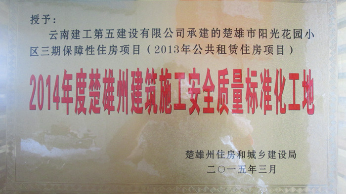 一分耕耘,一分收獲。近日,由五〇三直管項目部負責施工的楚雄市陽光花園小區(qū)三期保障性住房項目榮獲“2014年度楚雄州建筑施工安全質(zhì)量標準化工地”榮譽稱號。并于2015年3月24日正式授牌。 楚雄市陽光花園小區(qū)三期保障性住房項目總建筑面積為61103.75平方米。包括7棟、8棟、9棟、10棟、11棟共五棟,地下一層,地上18層...