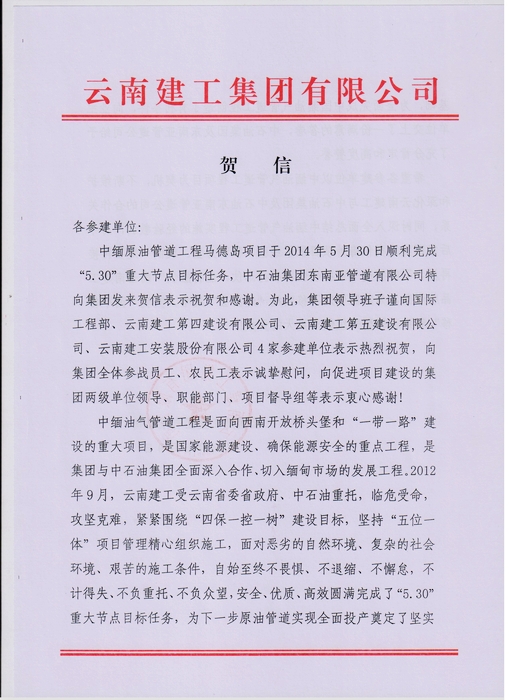 集團(tuán)致中緬原油管道工程馬德島項(xiàng)目參建單位的賀信